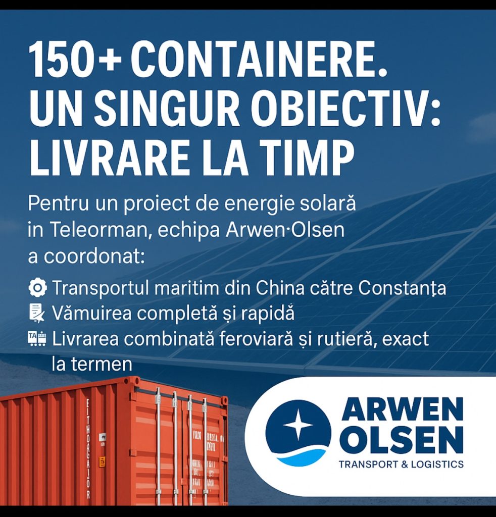 Studiu de caz: 150+ containere livrate la timp pentru un proiect de energie solară în Teleorman Proiectele mari de construcție a parcurilor fotovoltaice depind de livrări precise și sigure. Un singur container întârziat poate opri șantierul și poate genera costuri de zeci de mii de euro pe zi. Arwen Olsen a gestionat cu succes transportul […]